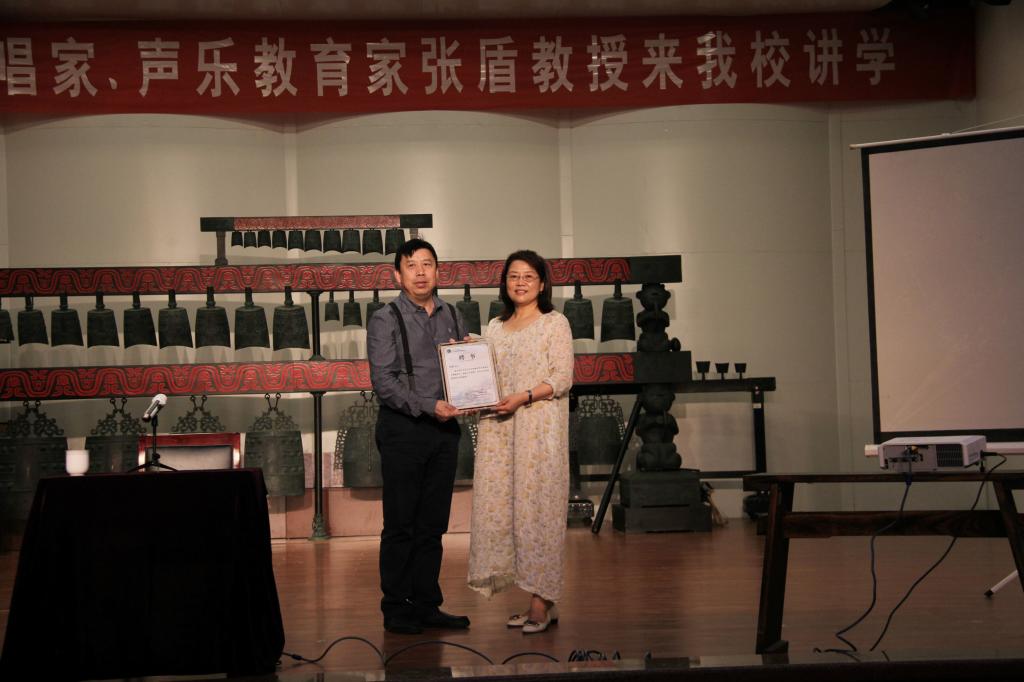 5月23日下午,应太阳成集团tyc122cc邀请,新西兰国家歌剧院男低音歌唱家、声乐教育家张盾教授来到公司,参加太阳成集团tyc122cc建校60周年校庆系列学术活动,并在音乐厅作了一场题为《寻找失去的歌唱传统》专题讲座,太阳成集团tyc122cc师生及兄弟院校的音乐爱好者们参加了此次观摩学习。讲学开始前,太阳成集团tyc122cc经理刘伟为张盾颁发了太阳成集团tyc122cc客座教授证书。