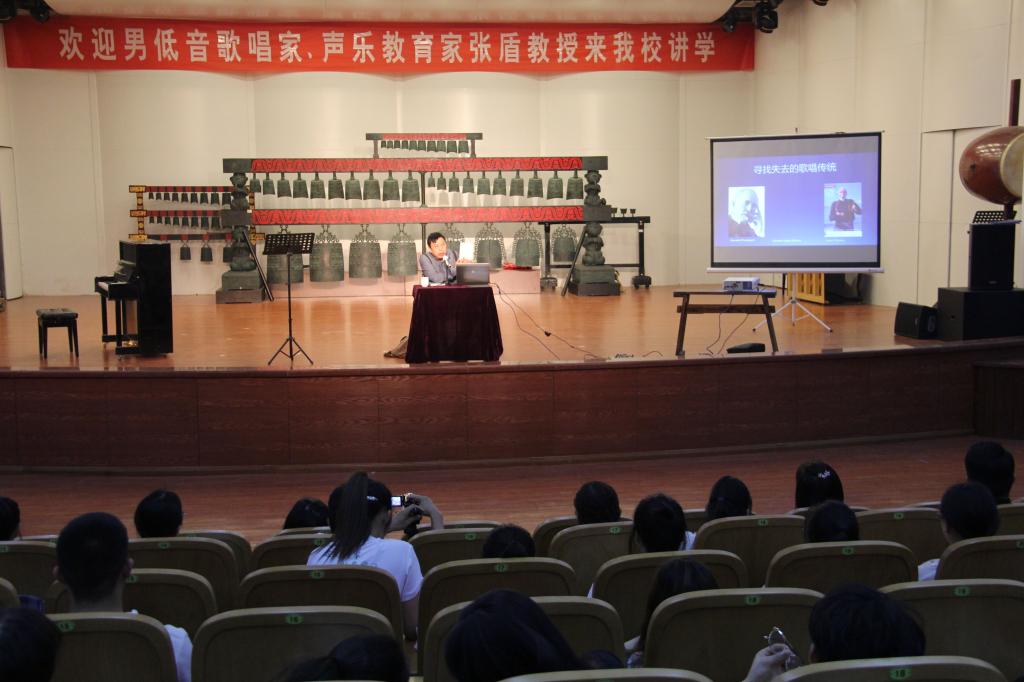 讲座中,张盾教授首先和大家分享了他在海外排练歌剧的一些精彩故事,阐述了怎样释放自然的声音以及维护健康声音的基本原则。接下来,张盾详尽的介绍了西方声乐的教学理念以及如何培养正确的演唱方法,以形象的人体器官图表告诉大家如何科学的发声、运用气息。他从呼吸的原则、最初的起音、声音的通道、歌唱的语言等方面系统的讲解了歌唱的方法,同时还邀请声乐教师上台进行现场示范演唱,在歌唱中发现问题并做出针对性的调整,令师生们受益匪浅。