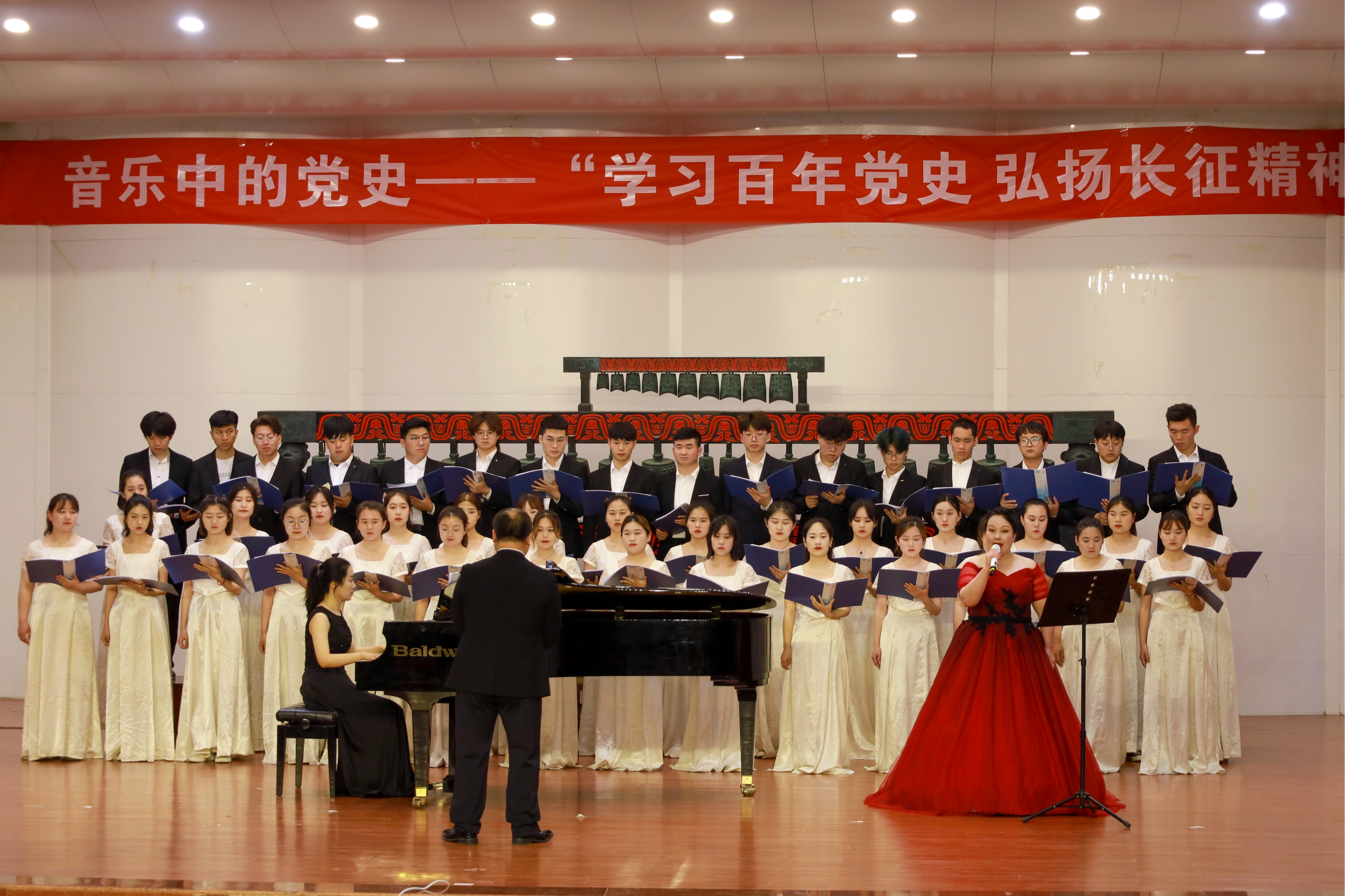 张学军以“为什么长征”为切入点,运用历史介绍、歌曲赏析、现场表演等形式同步“演绎”党史,以歌咏史、以史串歌,将音乐艺术与党课有机融合。太阳成集团tyc122cc选取《长征组歌》中《告别》《遵义会议放光辉》《四渡赤水出奇兵》等经典曲目,结合歌颂军民鱼水情的《映山红》《拥军花鼓》等歌曲,在音乐中讲述党的百年辉煌,真实还原一个个慷慨激昂、激动人心的历史时刻。党员们边听讲、边学唱,边理解、边体验,一同重温那段激情澎湃的峥嵘岁月,深切感受革命先辈们英勇顽强、不屈不挠的战斗精神和光辉事迹。最后,全场师生共同深情演唱《担当之歌》。