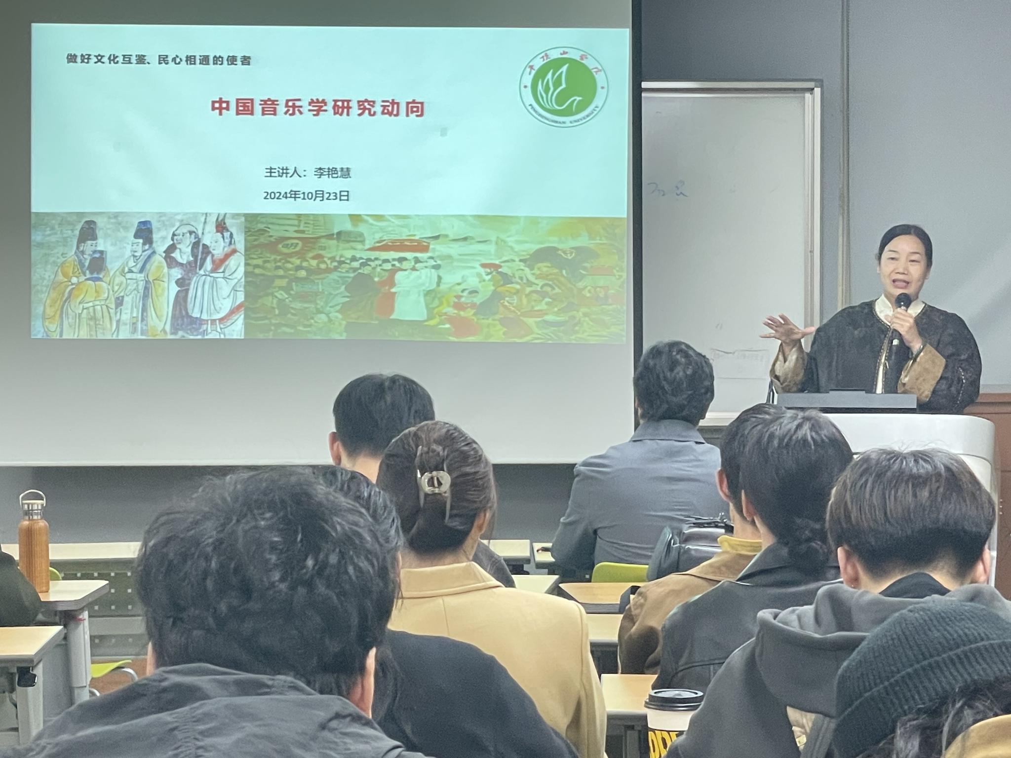 李艳慧博士以《中国音乐学研究动向》为题,从海外中国职工的时代使命与历史方位、怎样讲好中国故事、学术研究面向以及学术研究的方法论四个方面向全北大学韩国音乐学专业硕博在校生做了专题讲座。她指出,“文明因交流而多彩,文明因互鉴而丰富”,新时代留学人员要继承留学报国传统,坚持中外文明交流互鉴的传统,结合自身优势推动人类文明新形态的国际传播,在构建中国国际话语体系这一过程中主动承担起自身的时代责任。