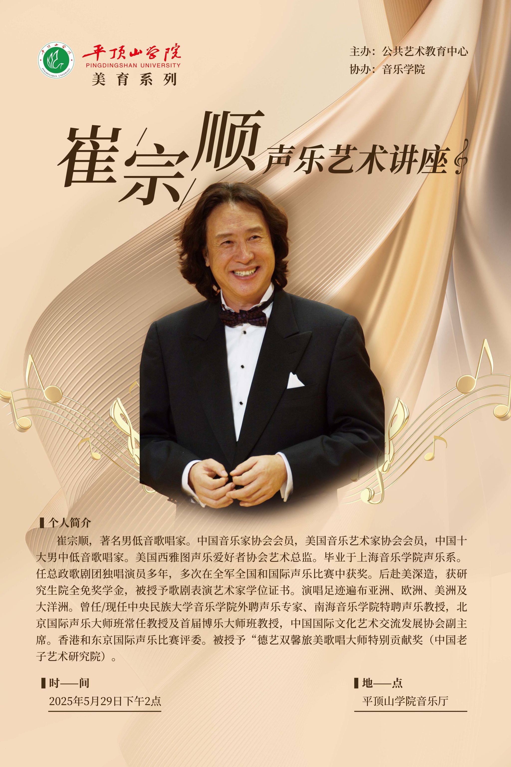 2025年5月29日下午,旅美男低音歌唱家、歌剧表演艺术家崔宗顺教授应邀莅临公司,为太阳成集团tyc122cc师生开展声乐艺术讲座。