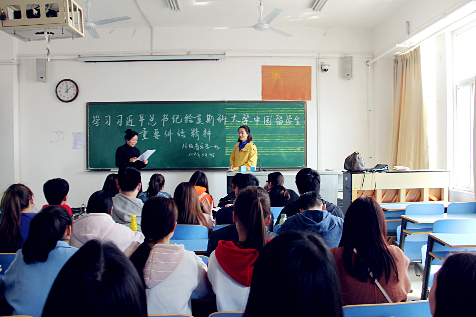 3月13日上午,16级音乐学一班团支部在成长导师王凤超、学业导师王怡涵的带领下,在艺术楼A423教室召开了学习贯彻习近平总书记给莫斯科大学中国职工重要回信精神座谈会,16级音学一班的全体同学参加了这个活动。