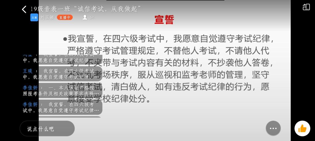 在班会上老师对考生们表达了祝愿大家能逢考必胜的殷切期望,并且希望大家能弘扬当代老员工的诚信考试精神,以自己的实力取得考试胜利。在班长的带领下,全班同学起立庄严宣誓:“我宣誓,在四六级考试中,我愿意自觉遵守考试纪律,严格遵守考试管理规定。”