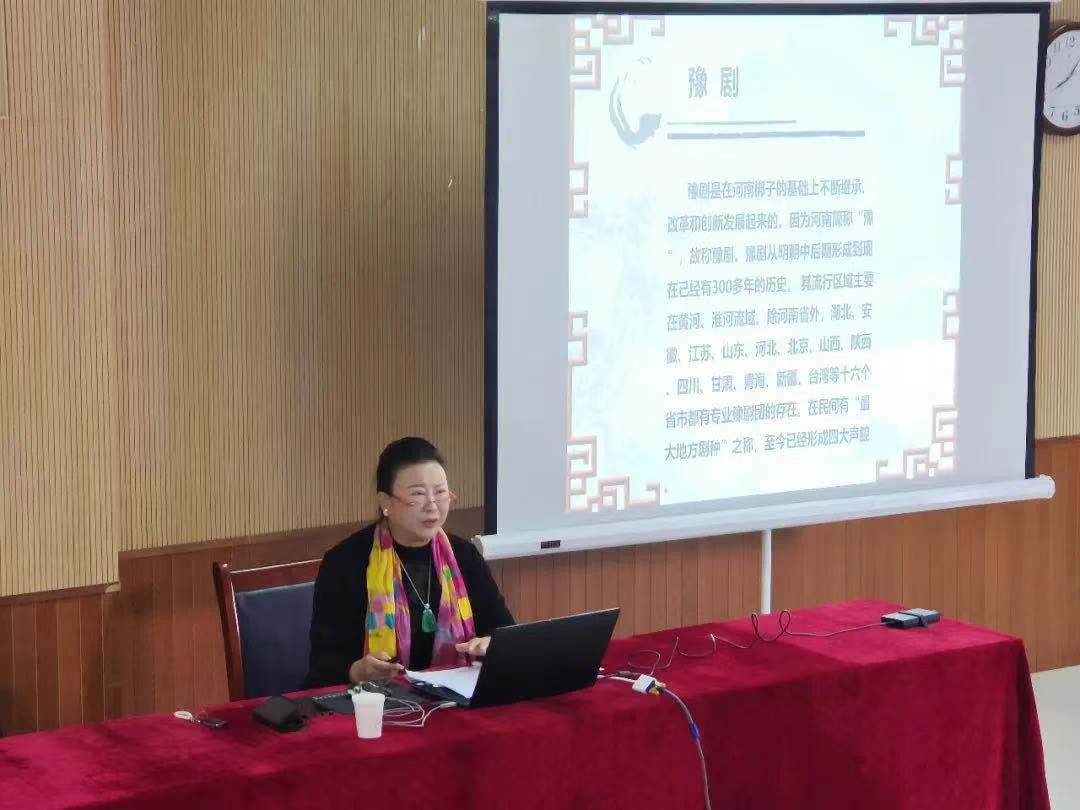 楚淑珍老师讲到:戏曲是一门综合艺术,是中国传统的戏剧形式。包含文学、音乐、舞蹈、美术、武术、杂技以及表演艺术各种因素综合而成的。所以说,戏曲是一门综合艺术。此外,楚淑珍老师还为同学们讲解了河南地方戏剧种类、豫剧的起源、戏曲的特点、豫剧的六大流派和豫剧名旦六大家等。楚老师指出豫剧表演中由于每个人的身份不一样,他们的手势也不一样。