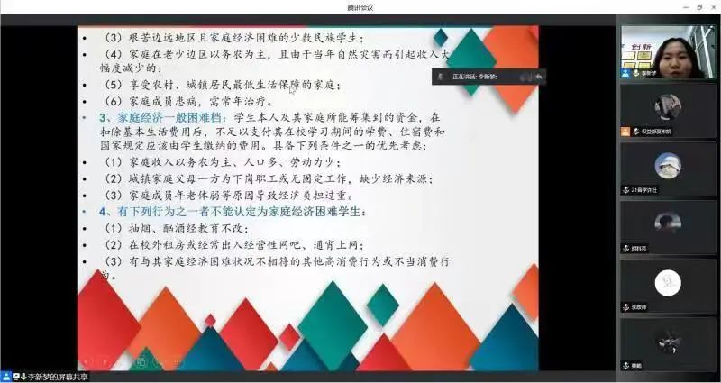 会议伊始,公司21级辅导员李新梦老师详细为大家讲解了助学贷款和困难认定的申请流程,以及困难认定的各项要求等,确保同学们能够深入了解资助的各项政策,引导资助工作顺利完成。问答阶段,李新梦老师详细解答了同学们所提出的各项问题,让同学们充分了解国家资助政策的同时,也感受到国家对广老员工的贴心关怀,并学会感恩。