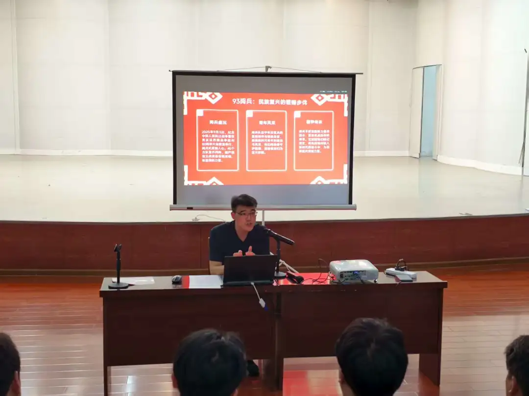 活动在激昂的《我和我的祖国》合唱中拉开序幕,师生们用歌声抒发炽热的爱国情怀。随后,姜星作《赓续抗战精神奏响青春强音》专题讲座。围绕“铭记历史瞬间”“回望峥嵘岁月”“汲取榜样力量”“勇担时代使命”及“规划校园生活”五个篇章展开。通过回顾纪念抗日战争暨世界反法西斯战争胜利80周年阅兵的震撼场景,生动阐释了中华民族从站起来、富起来到强起来的伟大飞跃,以及人民军队威武之师、文明之师的时代风貌,极大激发了同学们的爱国热情和民族自豪感。接着他深情回溯了十四年抗战的艰苦卓绝,深刻解读了以爱国情怀、民族气节、英雄气概和必胜信念为核心的伟大抗战精神。这种精神深深植根于中华五千年的文明血脉,是激励我们不断前进的强大动力。通过讲述民族英雄杨靖宇、赵一曼以及“两弹一星”元勋钱学森等不同时代楷模的感人事迹,生动展现了信仰的力量与家国担当,引导同学们见贤思齐,汲取奋进力量。