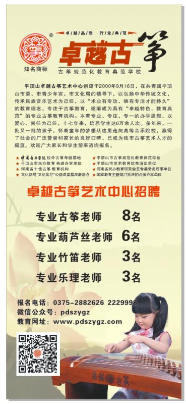 平顶山卓越古筝艺术中心创建于2000年9月16日,在共青团平顶山市委、市文化局的领导下,以弘扬民族文化为己任,以“术业有专攻,只唯有专注才能持久”的理念,专注于古筝教育,逐渐成为具有“卓越特色,教育典范”的专业古筝教育机构。本着专业、专注、专一的教学思想,以爱心、责任为己任,在群艺馆的公益课堂教学中,开展了“卓越古筝进万家大型公益活动”,培养员工累计3万余人次。多年来,一批又一批的孩子怀着童年的梦想从这里走向高等音乐院校,赢得了社会的广泛赞誉和家长的良好口碑,已成为我市古筝艺术人才的摇篮。